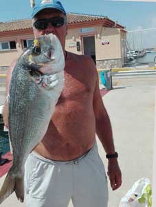 Esta dorada fue capturada por nuestro habitual compañero de pesca al volantín, a bordo del Gintonic, Jaime Martinez, haciendo, esta vez, pesca submarina en 7 metros de sonda (Pulse imagen para ampliar) |