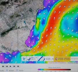 Arriba, detalle de la corriente marina prevista para el dia 29 de julio. Pulse para ampliar . ( Ver la direccion de la pagina de las corrientes previstas, en el indice en el apartado de direciones y pronostico del tiempo) Ese día teníamos una muy ligera corriente procedente del NE, pero no , la intensa del SO que estaba prevista a mas distancia de la costa.