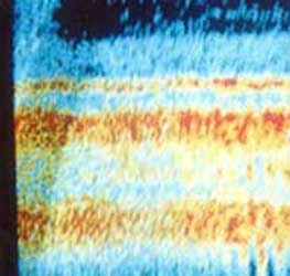 A la derecha, imagen del pecio con sus huecos azulados y el fondo en el que yace. Por arriba una prometedora imagen de peces , en blanco, que resultaron ser besugos, molleras jureles y besugo pequeño |
