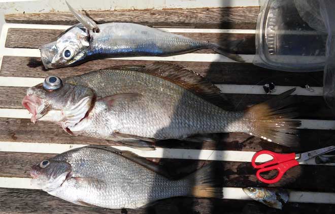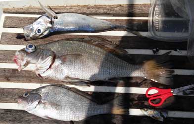 | Arriba dos verrugatos de fango (con el típico barbillón que lo diferencia entre otras cosas de la corva o corvallo, otra especie de la misma familia de siciénidos a al que mas se parece).Pulse para ampliar Estas dos piezas y una chopa azul de buen tamaño y jureles negros de 400 gr, fueron las mejores piezas |