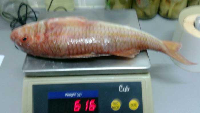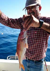 | Por todo ello, desistimos de pesca en aguas profundas y nos fuimos directamente a un pesquero de pagel en algo ma de 40 metros de sonda, en el que que en mi primera calada logré el pagel de medio quilo que muestra David en la foto de bajo y en la segunda una hermosa vidriada | ||||||