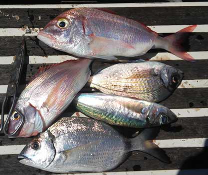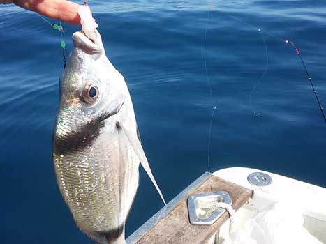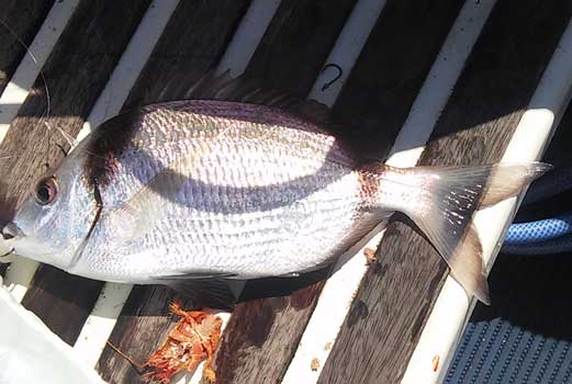 | Poco a poco fuimos pescando algunos pageles, vidriadas, serranos besugos, jureles que nos tuvieron muy entretenidos ...hasta que el viento norte arreció momentanemente y nos sacó del caladero. Lo que si fue cierto es que en el sitio que nos fondeamos con una Latitud de 000º 38 , no había en absoluto corriente marina, tal como anunciaba la prediccion.Con la circunstancia de que el día anterior, que estuvimos en este mismo pesquero, sin comprobar previamente la corriente, no pudimos pescarlo. Posteriormente probamos mas fuera, en busca de chopas y logramos solo unas pocas porque alli la corriente era muy intensa, pese a que el parte la daba moderada, |