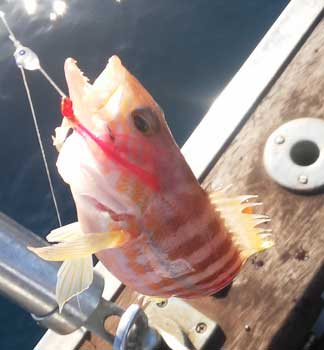 | Arriba a la izquierda un buen serrano que atacó una pequeña pluma que coloqué como excitador y para los jureles. Curiosamente con ella he logrado gran variedad de especies como besugos sorelas bogas y este serrano ese día. A la derecha otra vidriada que atacó un cangrejo ermitaño |