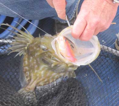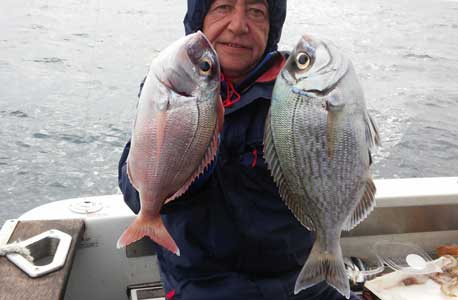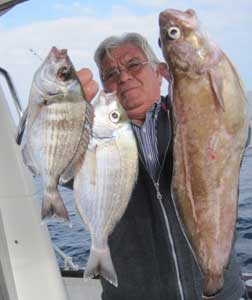 | Arriba, David con un pez de S. Pedro que atacó un pequeño tres colas que se había prendido en uno de los anzuelos del aparejo. (Pulse imagen de la derecha y bajo para ampliar) . Pesó1kg 700 y midió 43 cm |