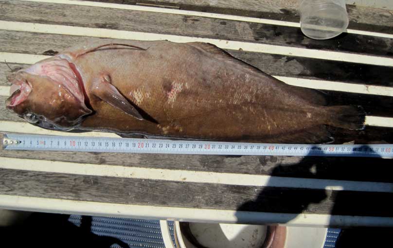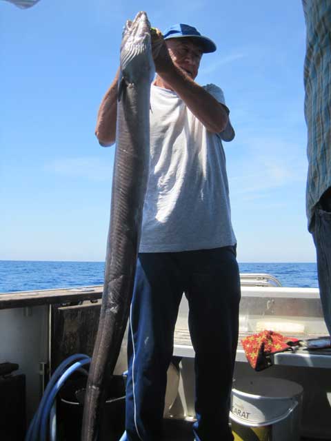 Arriba el patrón J.L. Martinez,con una brótola de 3 kg y 56 cm. A la derecha midiendo la brotolay debajo un cubo con otro de los congrios del día |