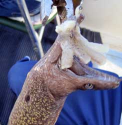 Detalle de la boca extensible y poblada de afilados dientes , de una murena de un poco mas de kilo, inevitable poblador de los pecios |