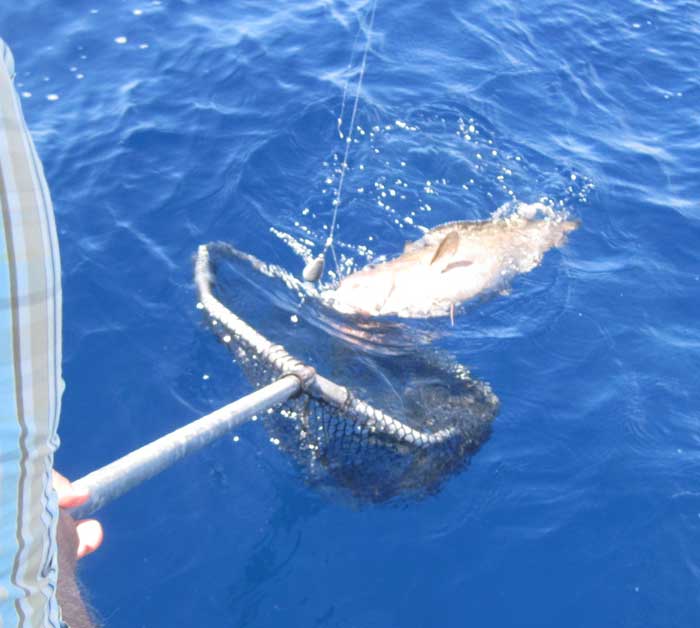 Al regresar les entraron otros dos atunes como los anteriores,que corrieron la misma suerte .A unas 15 millas de Santa Pola vieron saltar un gran emperador por la proa y al poco rato tuvieron una gran picada. Después de trabajarlo un rato se soltó.