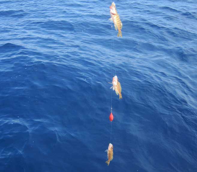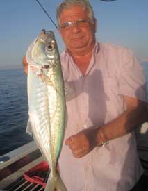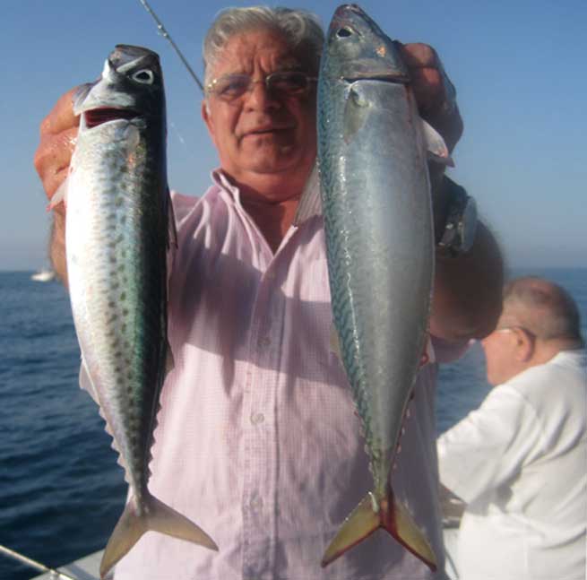 | Al comprobar que en el fondo había morralla, bogas, chuclas etc, pescamos en los distintos fondos que marcaba la sonda, logrando incluso dobletes de estorninos o jurelas que al tener un peso entre 300 y 400 gramos, daban buen juego |