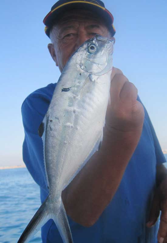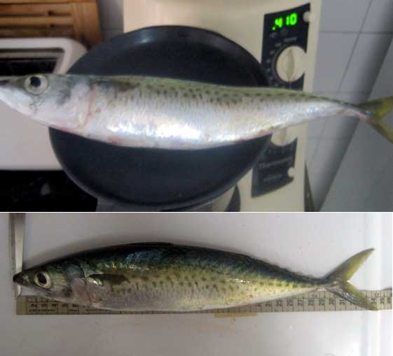 Curiosa imagen de un jurel con bandas verticales , que preserntan muchas especies, recién sacadas del agua, ocasionadas por el estress . A la dcha palomina |