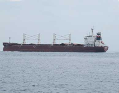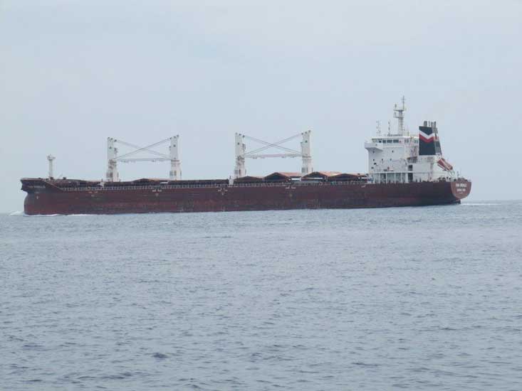 El día 27 de mayo, acompañado de su colega Vicente, salieron al Currican desde Santa Pola poniendo rumbo a aguas profundas Al llegar al veril de los 400 m. tuvieron que maniobrar al encontrarse con un gran mercante cuya imagen reproduzco , poniéndose entonces paralelos a él ya que coincidía con el rumbo a su pesquero favorito .Pescan de ordinario a una velocidad 8 nudos por lo poco a poco el mercante, les fue adelantando.