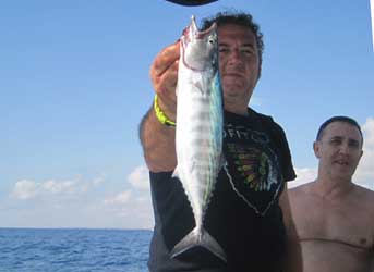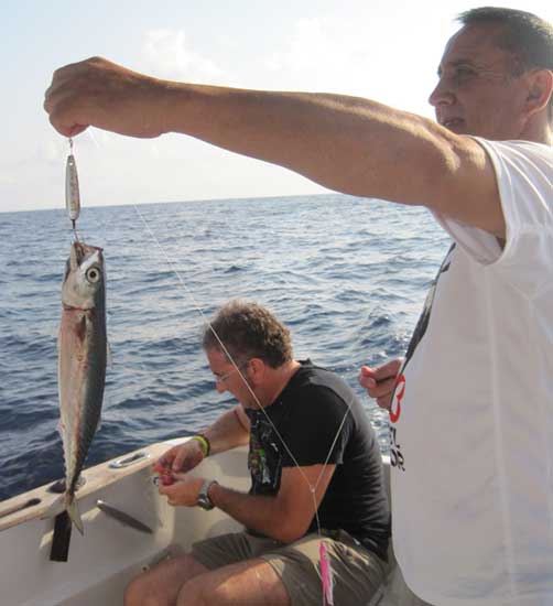 Una mañana de sorelas y galanes..y algo más Desde hace ya muchos años, en este mes de agosto, tenemos como favoritas dos pescas: la de la sorela y la del raó o galán. Ambas fueron, en otro tiempo, de excelentes resultados y también motivo de algún artículo que me fue publicado en Pesca a Bordo, y que luego, si gustan, pueden releer. Ese día, a primeros de agosto, salimos, a bordo del GINTONIC, bien temprano, para huir de las altas temperaturas que pronosticaban para el centro del día. En la primera parte de la mañana, fuimos a un conocido caladero muy próximo a Torrevieja, en busca de sorelas, cuya bravura y tamaño entre 400 y 600 gr hacen su pesca , muy divertida |