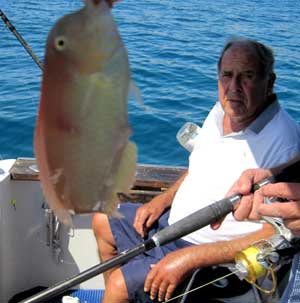 | En la segunda parte de la mañana, quisimos tentar los galanes o raós Xyirichtys novacula, por cierto que con pocos resultados. Quizás esto se debió, a que las aguas no estaban suficientemente claras. Con todo, pudimos degustar , ya en casa , este sabrosísimo pez cuyo precio- segun algunos-ha podido alcanzar en ocasiones precios astronómicos | |