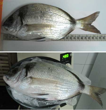Una buena dorada de piscifactoría (ver la intensa mancha negra del operculo) probablemente engordada en hábitat natural |
