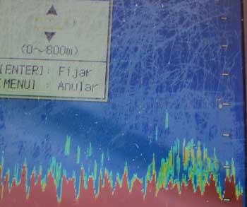 La imagen de la sonda, aunque no era demasiado significativa refleja una abundante fauna de doradas, la mayoría de piscifactoría y unas vidriadas de tamaño grande que nos diviertiron extraordinariamente |
