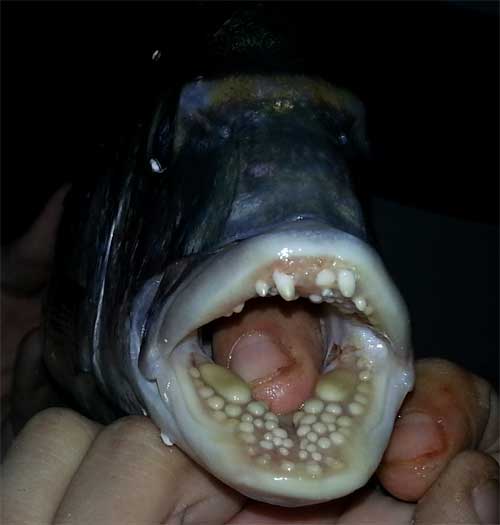 Arriba doradas de buen tamaño pescadas hace unas semanas. Pulse la imagen de la derecha y verá con detalle la poderosa boca llena de molares capaces de triturar incluso las conchas - refugio de los cangrejos ermitaños