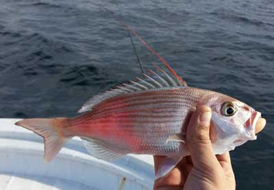 Bajo, una para mi muy interesante foto, pues si mi identificación es correcta, sería el primer ejemplar joven que veo - que yo recuerde-de la llamada sama de pluma o Dentex filosus o gibosus. Asi como ejemplares adultos de 12 a 14 kilos hemos capturado muchos a bordo de la embarcación Chambel, Pulse aquí y paginas siguientes curiosamente de juveniles como he dicho creo que no tengo ninguna foto |
