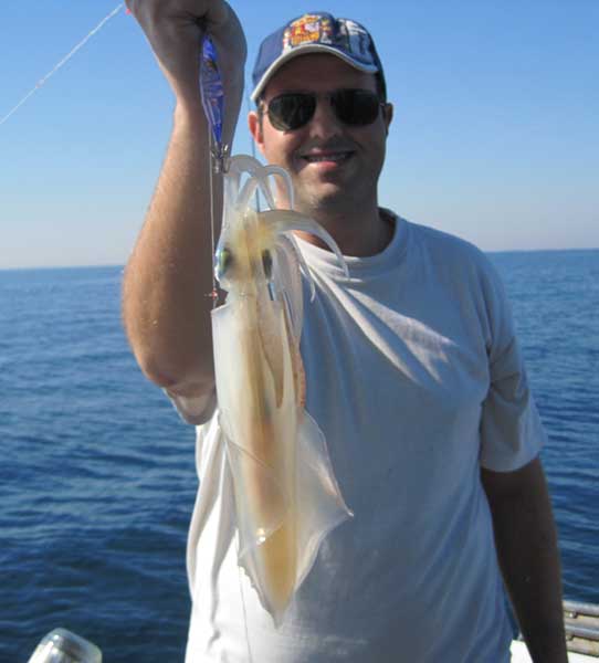 calamar que entró a un "pajarito" de color azul , en un aparejo mixto |