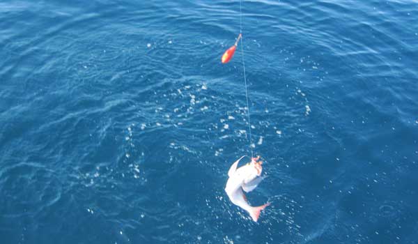 Se trata de Salvador Juan Campos, patrón de la embarcacion Enigma 2 , que tiene como puerto base Marina Internacional. Me manda las fotos de dos capturas recientes hechas por su esposa y él (siempre salen juntos de pesca). Lo curioso de una de las capturas es que el pez golondrina o chicharra le entró a un pajarito pues estaban pescando calamares.Pulsen las imágenes para ampliar |