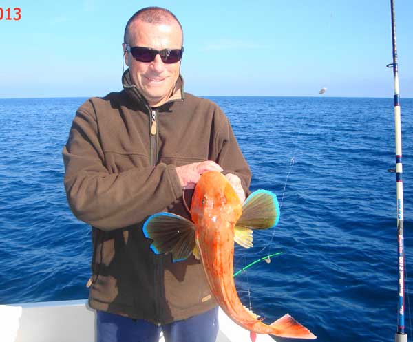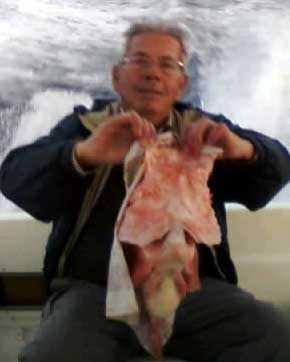 Foto de una gallineta pescada por Joaquín Caselles en el Planazo en unos 240 m. de sonda. Dice que no la pesaron pero que rondaría los 3 kg. Debe de tratarse, por la profundidad en la que la capturaron, una gallineta rosada (Scorpaena elongata ) - no se ve bien en la foto, que no es muy buena-