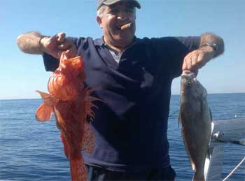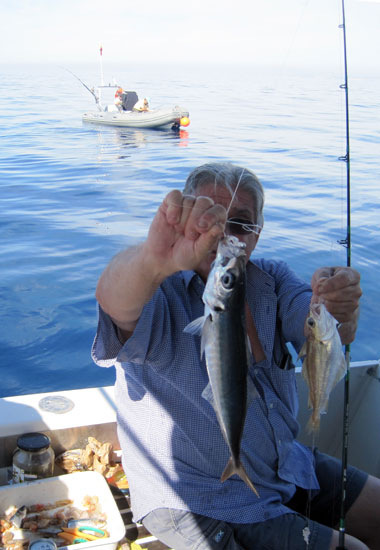 A bordo del GLAND, hicimos una tentativa de pesca en un acantilado submarino, antes rico en buenos ejemplares, pero ahora muy castigado por redes y palangres; por lo que al final, para distraernos un rato y llevar pescado a casa , nos fondeamos en un sitio tradicional de aligotes y caballas. Allí en una hora y media escasa - pues queríamos volver pronto al puerto-.hicimos una abundante, (aunque modesta por su contenido) pesquera de aligotes, caballas y estorninos.