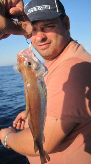 Sólamente el patrón, Luis, tuvo una gran emoción al levantar, hasta casi la superficie, un buen ejemplar de un pescado (probablemente un dentón) que al final rompió el fino sedal con el que pescaba. Bajo unas imágenes de la pesca de ese dia