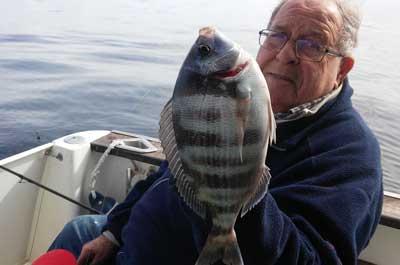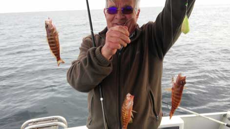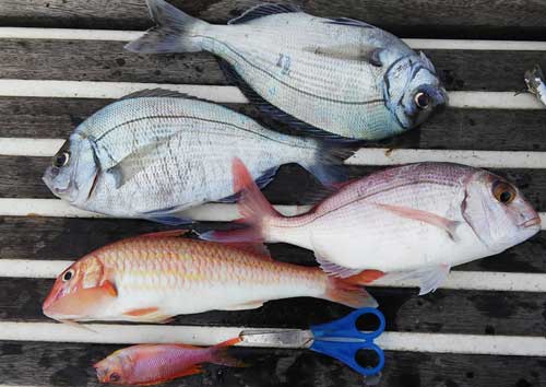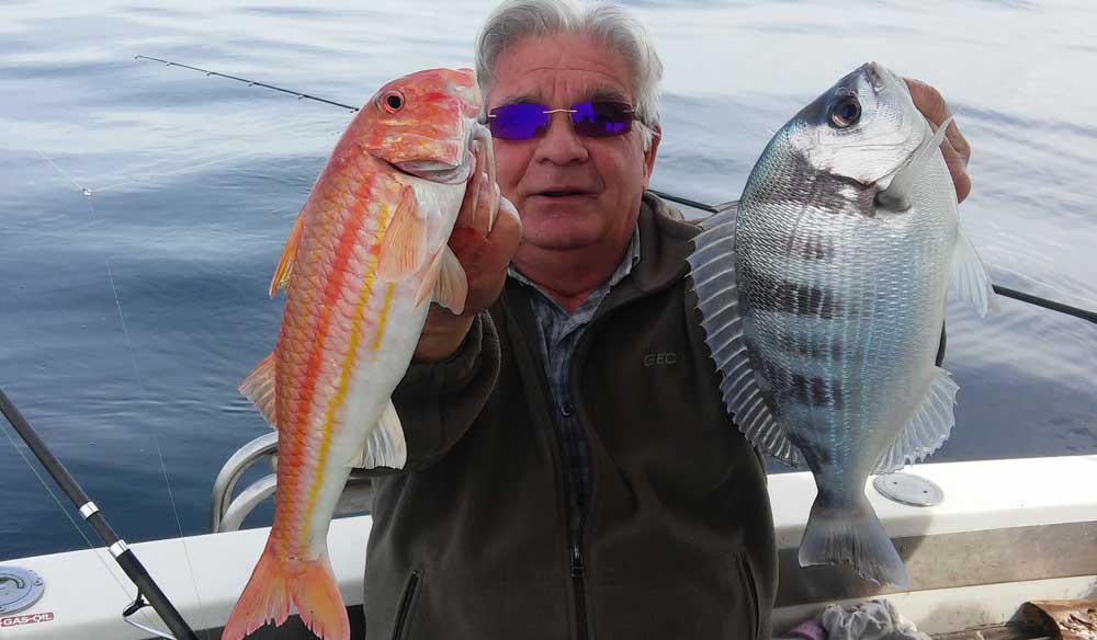Arriba David con la pieza reina de la mañana un salmonete de roca 30 cm y 350 gr de peso. A la derecha una buena vidriada de las varias que capturamos en este rico enclave |