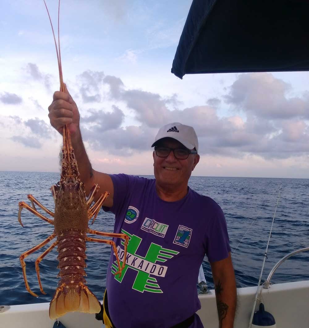 un conocido pescador jubilado de Torrevieja. Era una langosta de buen porte, cuyo peso lo estimaron en algo mas de 2 kg.( Foto remitida por Antonio Box del Club Marina Internacional) |