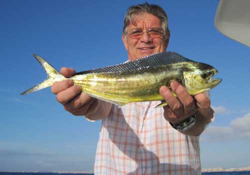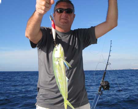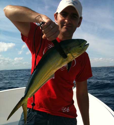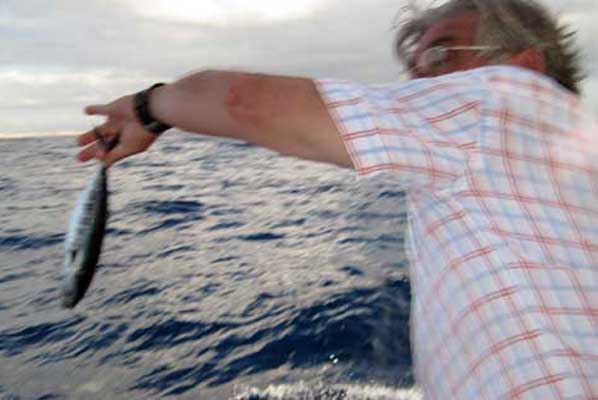 Mi compañero Cesar luchando con un lampuga de kilo.Utilizando un poco de cebo natural, y practicando el jigging a embarcación a la deriva, e incluso manteniendo la primera lampuga, capturada al currican , sin sacar del agua, logramos mantener el banco juntos al barco, mas de una hora, hasta que dijimos basta ya