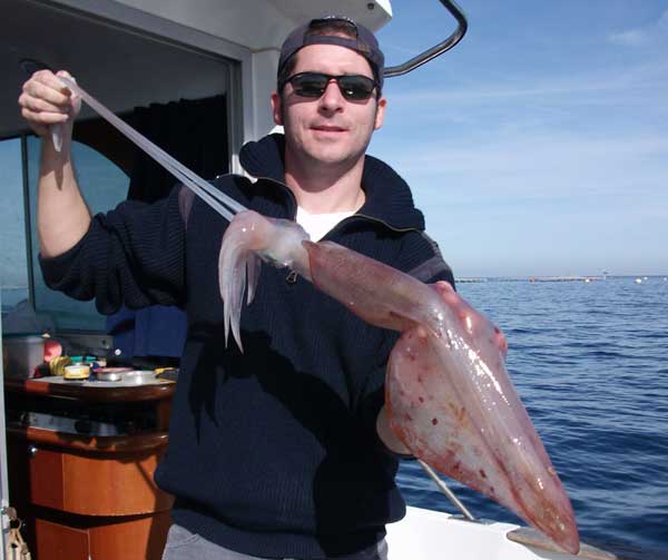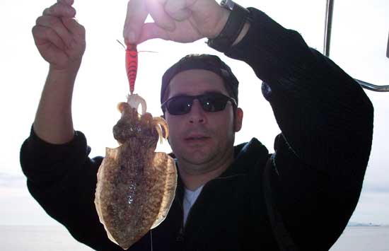 Bajo, unas cuantas fotos de la pesca de ese día. Normalmente , si hay marcas sospechosas de calamares por encima del fondo, utilizamos terminales en los que, el de mas arriba, es un señuelo para ellos: un squid hunter o "pajarito". No estorba y puede haber sorpresas agradables como las que demuestran dos de las imágenes. Ese dia se prendieron de nuestros señuelos , una vez una sepia y otra un calamar de kilo y medio y 90 cm de largo total . Pulse imagen para ampliar Vea mas información sobre pesca del calamar |