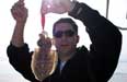 Nosotros optamos por intentar pescar en los sitios tradicionales de doradas que otros años, por esta época, abundaban en fondos rocosos, a una cuantas millas de Torrevieja. No las encontramos, aunque sí dimos, como el año anterior, con un enclave donde las chopas tienen, por lo que se ve, una cita anual (¿abundancia de comida , freza? ), haciéndonos con un buen númerode ellas con peso que osciló entre los 300 y 700 gr. Posteriormente quedó descartado el motivo de posible de freza, al abrir el vientre de estos animales, ya adultos, ya que tenían sus gonadas vacías. Es realmente interesante esta pesca, que requiere no poca habilidad del pescador, dado el toque, de ordinario suave, de este esparido del género Spondyliosoma. Mi compañero de barco en esta ocasión era J.M. Medina , patrón del Avizor, es un experto en la materia. En alguna ocasión me ha dado un "repaso" en esta modalidad de pesca. El tiene un término significativo para definir el toque especial de la chopa cuando come. Lo expresa diciendo que le "blandea" la puntera. Es decir, que el pescado al comer, inclina hacia abajo la puntera con suavidad. No hay que precipitarse en tirar, sino sabiendo que son ellas, debemos dejarle comer otra vez, y entonces darle un buen tirón. Hay que estar muy atento, porque el toque como he dicho no es brusco. Luego, una vez clavado, eso si, se defiende con bravura, dando tarascadas hacia abajo, merced a su ancho cuerpo musculoso y su cola poderosa, por lo que la emoción de la lucha está servida. Hasta pocos metros antes de llegar a la superficie, tira una y otra vez. Luego, sea por descompresión o el agotamiento, se deja subir mas fácilmente. La chopa no es un pez "cazador", sino que come animáculos pegados a la pared de los acantilados (pequeños crustaceos o gusanos del fondo) por lo que no ataca bruscamente para hacerse con el alimento. Bajo una serie de imagenes de un buen día de pesca, incluyendo imágenes de la sonda |