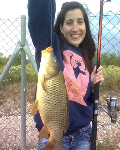 Excepcionalmente incluyo la foto de una pesquera de agua dulce. La de una carpa que muestra esta guapa pescadora, novia de mi compañero de barco M.Ruiz. Tras algun día de mar con "porra incluida"- por fortuna no frecuentes-, uno puede consolarse también en tierra con una buena compañía y un carpote de dos kilos |