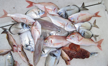 Arriba, dorada de kilo y un pagel de mas de medio, fueron las mejores piezas de este modesto pero bonito rancho a bordo del Avizor: chopas, serranos, tres colas, mojarras, pagel y dorada, pescados en un fondo rocoso a pocas millas del puerto de Torrevieja