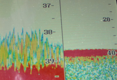 unas 3 millas de la bocana, en un caladero en el que otros años habíamos detectado la presencia de doradas.