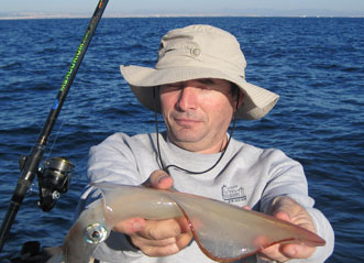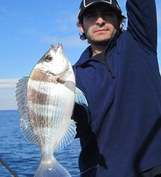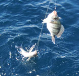 Bajo, pescando al jigging con señuelos Halco de 35 gr- con el que pescaba Jose M.era del 45-, logramos unas cuantas seriolas de unos 750 gr y...una sorprendente captura: Una salpa que atacó directamente al señuelo a unos 15 m. de profundidad, o, (cosa mas probable en el caso de esta especie, no depredadora), siguió con curiosidad al señuelo, desde el fondo hasta mas arriba y accidentalmente se clavó en una de las sacudidas que se les da a los jiggs. De cualquier modo, un caso excepcional
