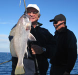 Despues de tocar inumerables caladeros, dimos con un aceptable enclave, en unos 35 m. de sonda donde nos hicimos con un buen puñado de vidriadas, serranos, alguna chopa, y donde capturamos al jigging algunas seriolas. Al atardecer, el patrón, José Manuel, en su primera calada clavó un buen dentón de mas de dos kilos. Otro tanto logró un colega que pescaba a la deriva junto a nosotros, Paco, de Cartagena, que pescó otro dentón algo menor, cuyo peso le calculamos que andaría cerca de los dos kilos.