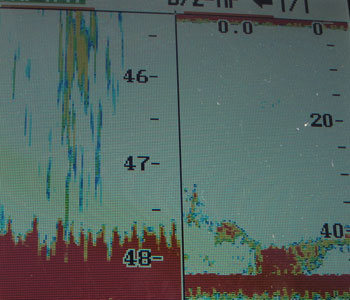 sus masivos ataques que impedían comer a las muchas chopas que había en este enclave. (Vea la significativa imagen de la sonda, que refleja la banda de 7 metros por encima del fondo rocoso, con vegetacion de corales, y abundante pescado en el fondo)