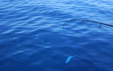 La pesca de lampugas , localizándolas al curricán y pescándolas luego al jigging, ha continuado. A primeros de mes hemos pesado ya ejemplares de 1,200 gr, que ofrecen una resistencia endiablada para las finas cañas que utilizamos. No es raro pescando todos los de abordo al jigging, concentrar bajo del barco varias docenas de lampugas, que se lanzan competitivamente tras los señuelos , en cuanto caen al agua y les damos varias sacudidas. Ese día comprobamos que también se lanzaban tras las rapalas Rh de pequeño tamaño, consiguiendo también al jiggig varias lampugas.Pero ciertamente las rapalas eran mas conflictivas, ya que motivaban a menudo arrastres defectuosos, al trabarse, la potera delantera, en la línea. |