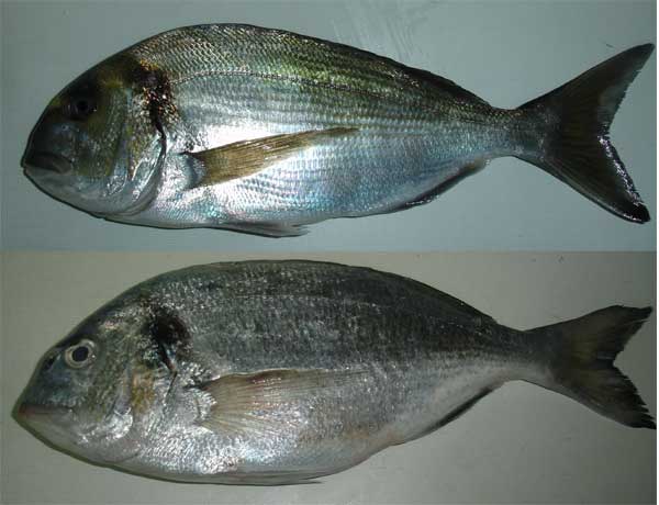 Diferencias entre la dorada salvaje y la de piscifactoría Arriba, dorada "salvaje". Ya en su morfología externa presenta diferencias, pues ésta es mas esbelta y menos rechoncha que la de piscifactoria, que tiene la parte inferior de su cuerpo y vientre mas redondeados. Las escamas de la salvaje están mas apretadas y firmes, su aleta caudal es a simple vista lo que marca mas la diferencia; las puntas de la misma son aguzadas en la salvaje y desgastadas, por el roce de la jaula de engorde, en la de piscifactoría. |