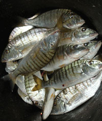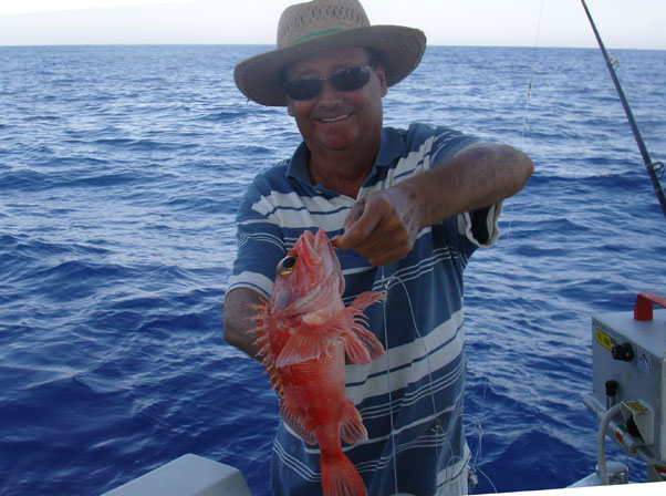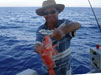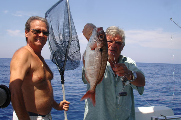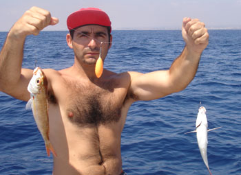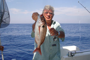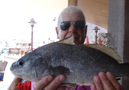![]() También en agosto, pescando de noche, en sitios puntuales, cerca de los algueres , se pueden conseguir piezas interesantes, como sargos de mas de kilo, alguna dorada y corva, como la que muestra este veterano, Fernando Marcos, compañero de tantas buenas pesqueras sobre pecios |