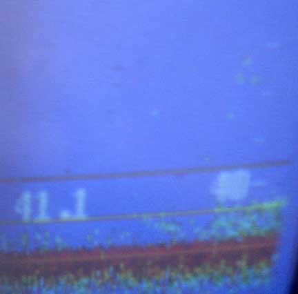 Recojo esta imagen defectuosa de la sonda del Chambel Dos, para ilustrar el hecho de que pese a la pobreza de pescado en la sonda, los toques de doradas y corvinas eran casi constantes seguramente porque el banco de doradas y corvinas no era muy apretado, pero sí pegado al fondo