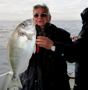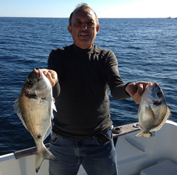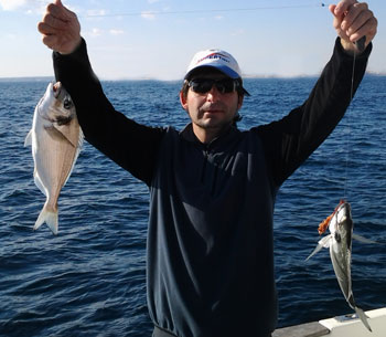 | Arriba, Jaime y David con doradas de de cerca del kilo.La mar permaneció en calma casi toda la mañana |