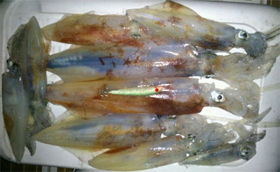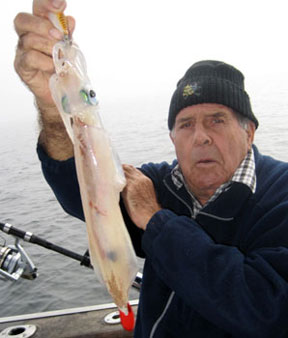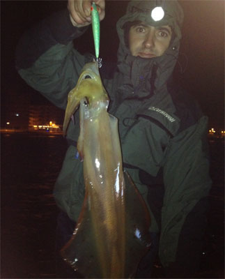 | Pese al frio de la tarde - noche, algunos colegas, como nuestro buen amigo Javi de Torrepesca, salen estos días a pescar al curricán el calamar en unos 9 metros de agua. Nos dice Javi, que pesca a una velocidad de 2 a 2,5 nudos con señuelos de calamar con babero. |