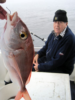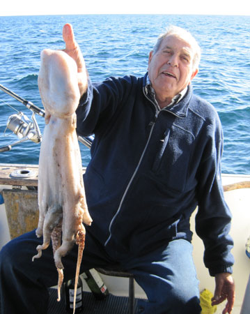 | Han continuado las pesqueras de calamares .Casi a finales de mes a bordo del GINTONIC quisimos pescar al pagel y tentar también a los calamares a embarcacion fondeada. Resultó un pesca muy entretenida, "defendiéndonos" de la extraordinariamente abundante morralla con el uso casi exclusivo de ermitaños. Con ellos logramos unos cuantos pagelones, todos de medio kilo en adelante y unas hermosas vidriadas. Solo logramos un gran calamar . Fue una jornada agradable, con el único inconveniente de una espesa niebla que nos sorprendió yendo al pesquero y una vez en el, tuvimos una corriente bastante intensa que dificultó el fijar los pageles que comenzaron a entrar nada llegados al pesquero. Bajo algunas fotos de la pesca de esa mañana |