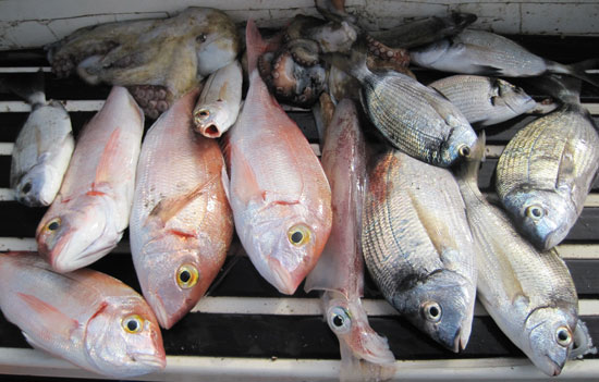 Una buena pesquera de sargo vidriadas, pageles, doradas y un calamar ( Fotos del patrón Luis Llor) |