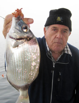 Bajo, mis dos compañeros, con una dorada de kilo y cuarto y 46 cm de talla, y un hermoso pagel |