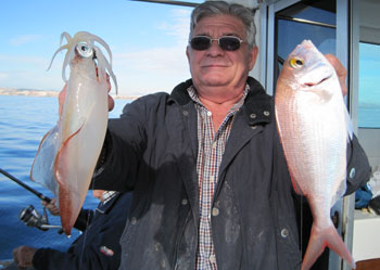 | Arriba a la izda. David con un buen calamar y un pagel de medio kg, que subieron a bordo al mismo tiempo en dos diferentes cañas. A la derecha el patrón con un dorada de unos 700 gr |
