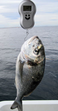 | Aprovechando un buen pronóstico del tiempo , abordo del GINTONIC , volvimos a hacer una salida de pesca, el día 13 a por doradas .No pescamos demasiadas pero algunas como se ven en las imágenes de buen peso y talla. Bajo, mis compañeros David Terrés y el patrón J.L. Martínez . Pulse imagen de la derecha para ver peso de 980 gr para una talla de 43 cm, de una de ellas |
