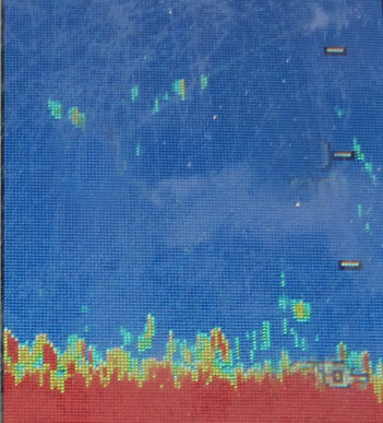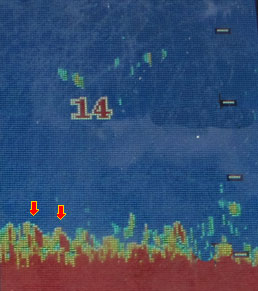 A la izda, imagen en la sonda de uno de los fondos antes citados. Las imágenes señaladas por las flechas puede que correspondan precisamente a falsos corales. La vegetación en la sonda se ve, de ordinario, como manchas amarillentas. Pero si es algo calcárea ( como es el caso del falso coral), el fondo escaso y la intensidad de la sonda elevada, pueden simular manchitas de pescado pegado al piso.