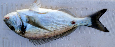 Arriba, sargo picudo de 25 cm. Bajo, dorada de 42 cm y mas de kilo y cuarto . (Para 40,5 cm de talla pesan 1,100) Edad : 4 años