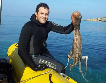 Dos curiosidades sobre los pulpos. En esta zona, capturamos este pulpo de mas de dos kilos de peso, cuyo color blanquecino, lo adquirió al meterlo- aun vivo-en una bolsa blanca de plástico, gracias a su poder de cambiar de color (mimetismo), de acuerdo con el color del hábitat . Otra curiosidad es su poder de regenerar sus patas . Este pulpo, por lo visto, fue atacado en numerosas ocasiones, probablemente por murenas o dentones-la zona es rica en ellos-. Si pulsa la imagen verá patas en vías de regeneración y otras en las que se ve claramente su regeneración casi completa, visibles al asentar sobre zonas gruesas de alguna pata, secciones mas finas, siendo sensiblemente mas cortas que las normales del peso y talla de este ejemplar.